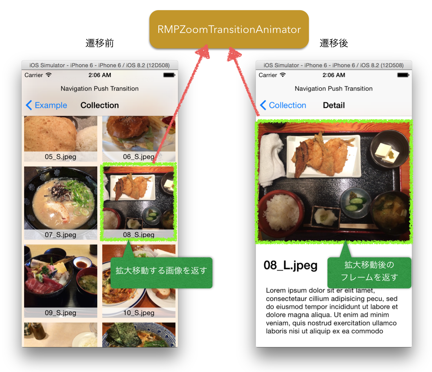 アニメーションを行うanimateTransition:(id)transitionContextで遷移前のViewControllerと遷移後のViewControllerからズームアニメーションを行う画像や遷移後にぴったりとはまる位置を取得するようにしています。だいたいのイメージを下の画像にまとめています。この移動させる画像や位置は先ほど述べたように、ライブラリの利用者側に全て委ねています。どんな風に取得すればいいかというのは、ライブラリとは関係ないのですがコード自体はExampleプロジェクトで書いているので、参考になるかと思います。