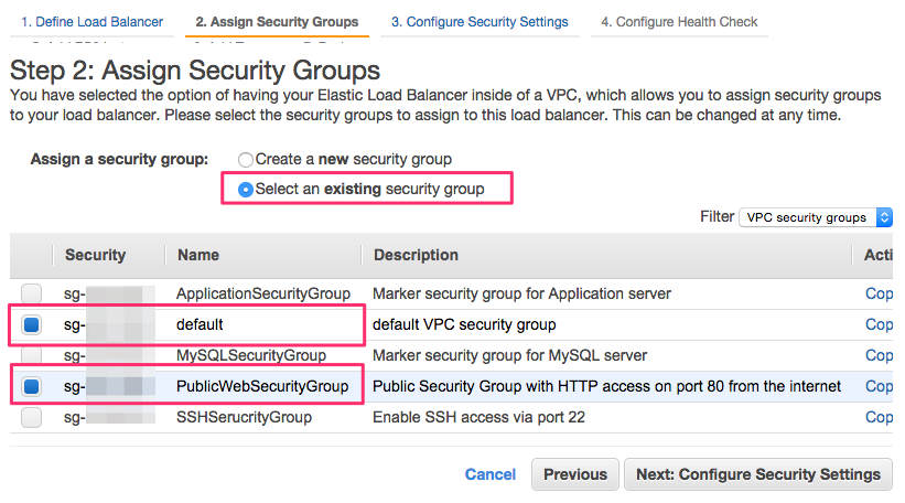 セキュリティグループを選択します。default、PublicWebSecurityGroupを選択します。