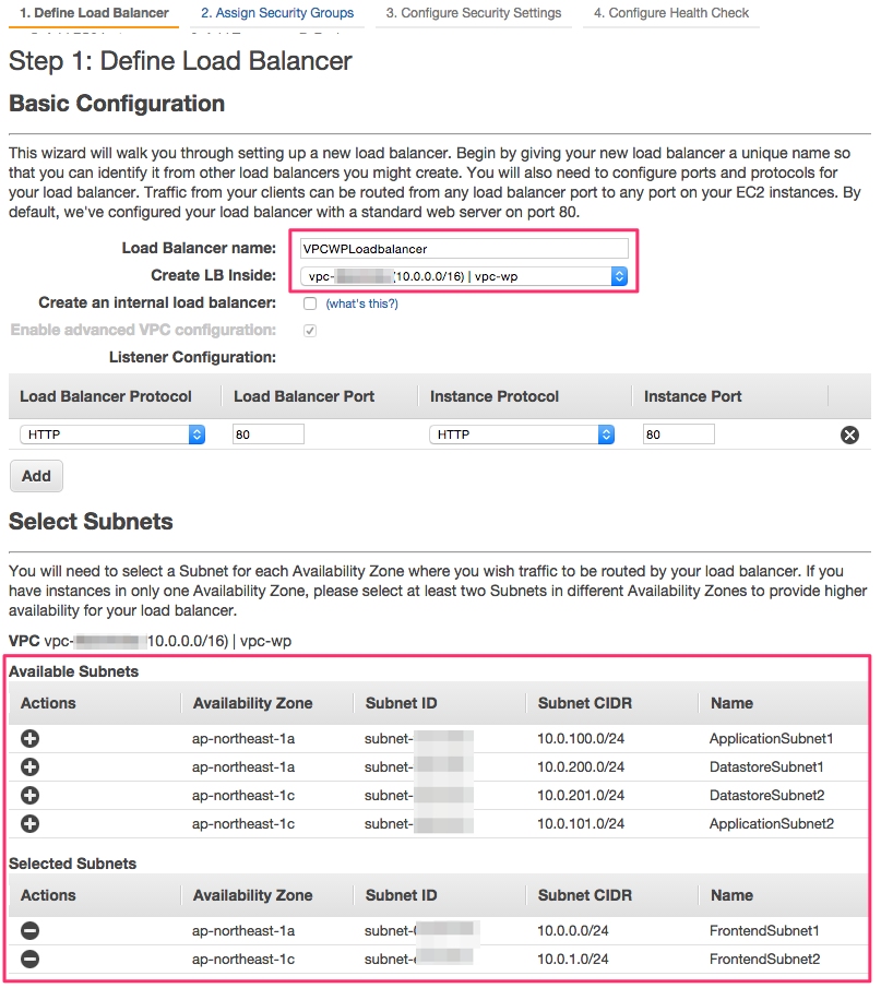 Load Balancer Nameを入力し、Create LB Insideに今回作成した VPC を選択 Listener ConfigurationにはHTTPが最初から設定されているので、そのままで OKSelect Subnetsにある一覧からFrontendSubnet1,FrontendSubnet2を選択