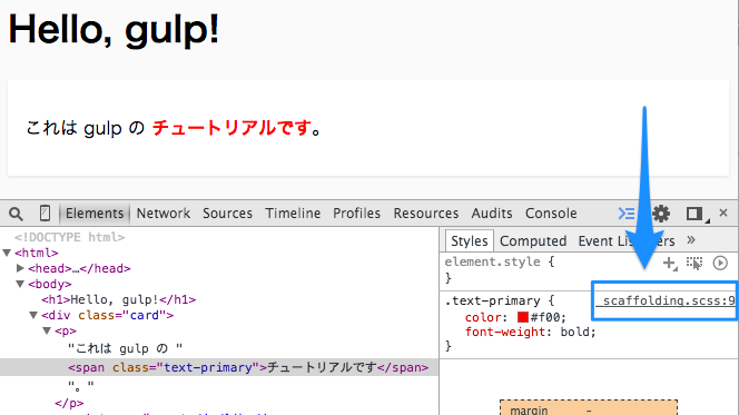 Web ブラウザにはコンパイルされた CSS が読み込まれるわけですが、複数の SCSS ファイルが結合されたり mixin 等が展開された状態なので、そのままではデバッグが非常に困難です。SourceMap を導入すれば、Chrome の dev ツールなどで CSS を見た時に、そのクラスがコンパイル前の SCSS のどの部分にあたるのかという情報が分かるようになります。