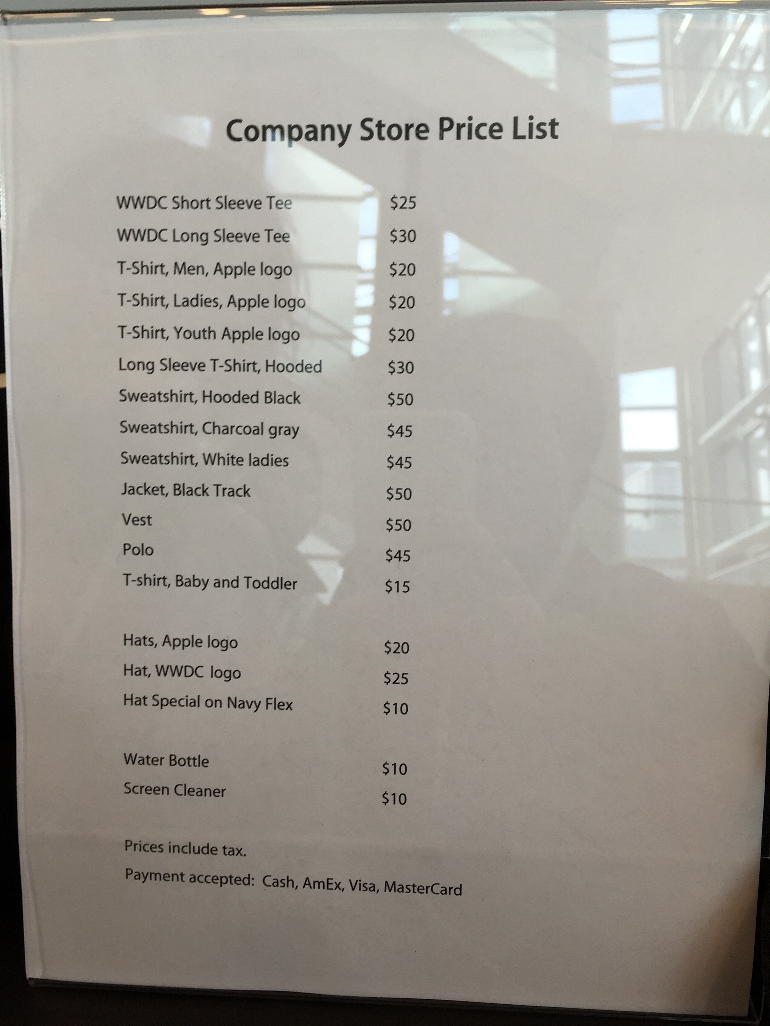 2日目になると、モスコーニセンターの2階にApple本社のCompany Storeが出店されます。ここではWWDC15オリジナルのTシャツやキャップ、Appleロゴ入りTシャツなどが販売されます。最終日になると売り切れ多数だったので、欲しい場合は早めにチェックしに行った方がよさそうです。