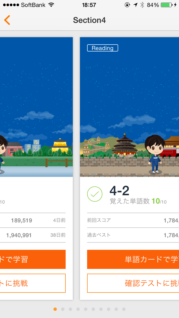あるいは弊社の英単語サプリで採用しているような、表示部分はカード型のコンテンツにし左右のコンテンツが少し見える状態にして表示しておきます。そして、まさにiPhoneのホーム画面のようにPageControlも置くことでユーザーは自然とスワイプできることに気づくことができると思うと言っていました。