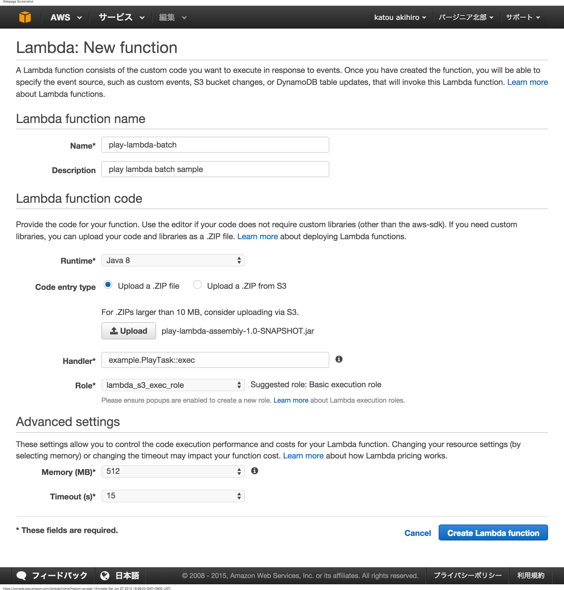 以下のように入力して[Create Lambda function]します(ボタンをクリック)。