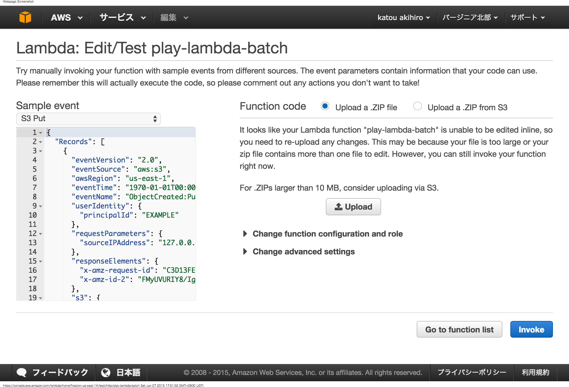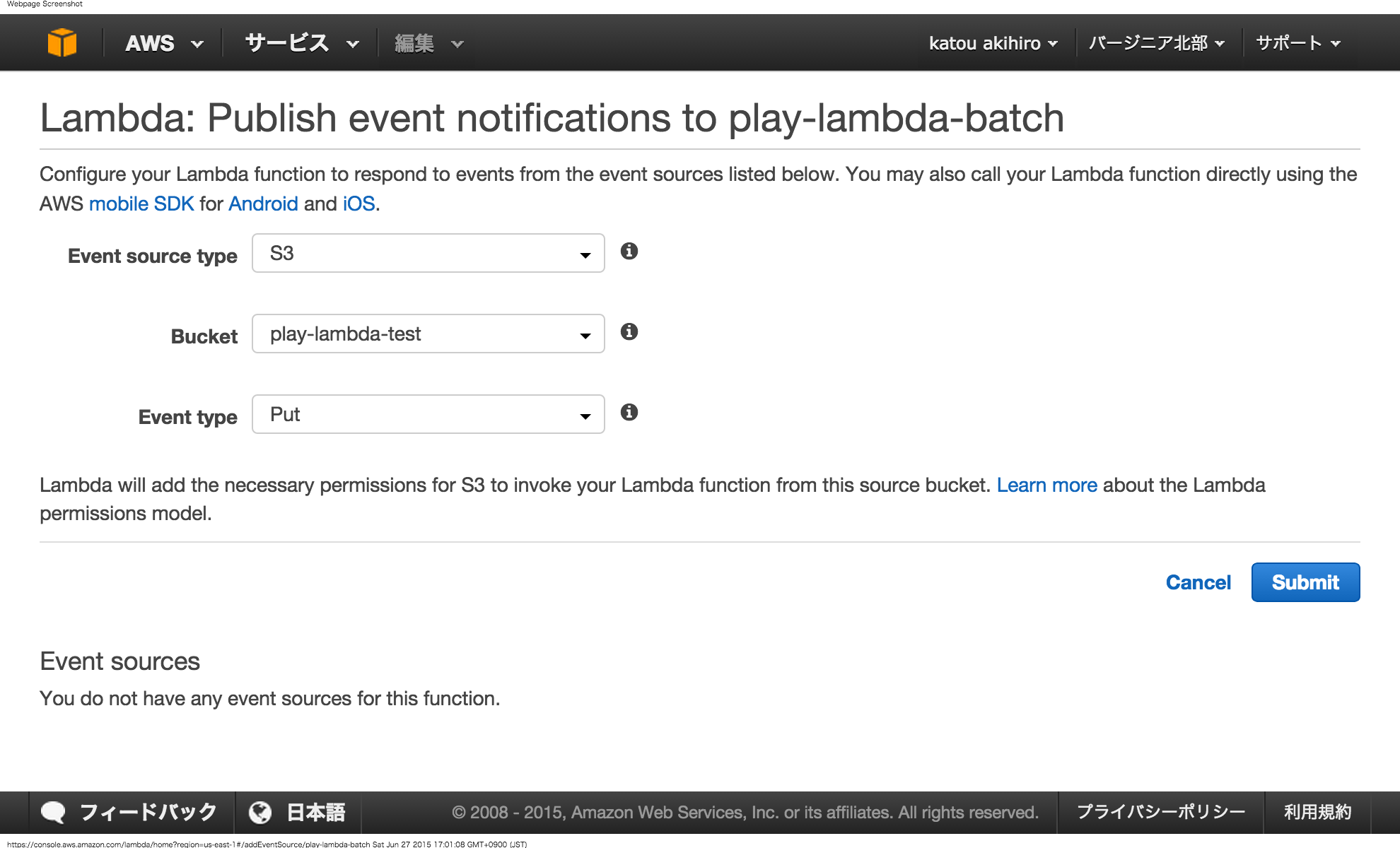 ※ 上の画像で Role の lambda_s3_exec_roleは S3 execution role から新規に作成したものです。