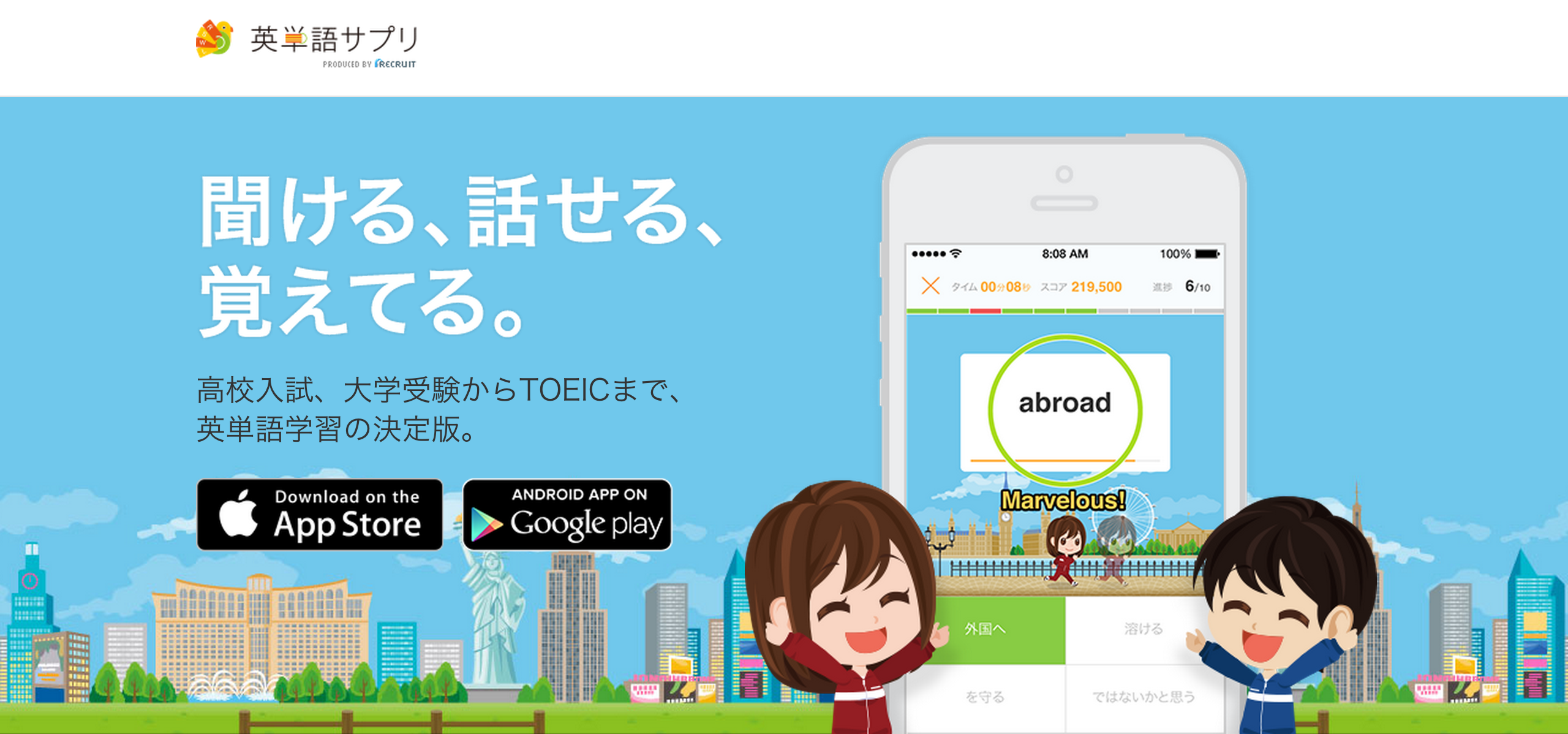 英単語サプリとは、聞ける・話せる・覚えてるをコンセプトとした高校受験からTOEICまで対策できる英単語学習のサービスです。