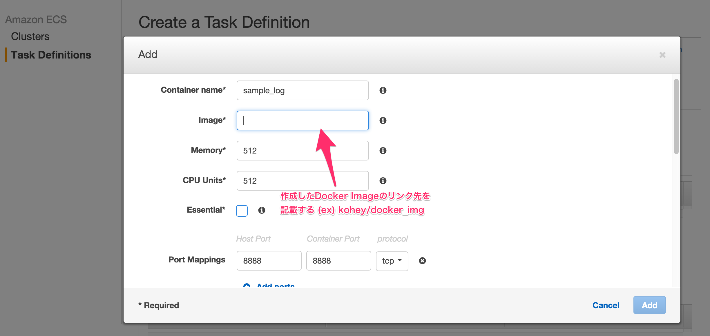 ECSの詳細はこのエントリでは割愛しますが、作成したDockerイメージを下図のように指定し(task-definitionの設定)、その後、コンテナを立ち上げることが可能です(create-service or run-task)。