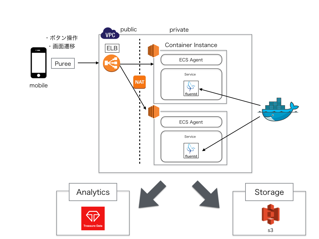 ログ収集を行うみんな大好きfluentdのDockerコンテナを作成し、それらを全てAmazon EC2 Container Service(ECS)で動かすようにしました。