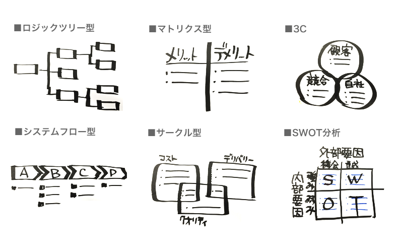 議論が進むにつれて板書も構造化しながら表記する必要があります。今話しているのは質問なのか?拡散議論なのか?決定なのか?ファシリテーターが他の方がしているのであれば事前に打ち合わせを行い板書の構造化を行いながら進めるのがよいと思います。