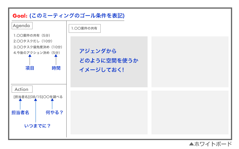 先に『ゴール』、『アジェンダ+時間』、『アクション』を表記しておくことがとても大切です。こうしておくことで、たとえ議論が違う方向に脱線してしまった場合でもすぐに話を戻すことができます。