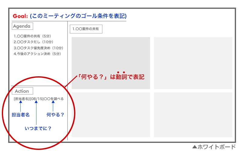 3.MTG終了まとめではアクション事項を「誰が」「いつまでに」「何をする」を参加者にコミットさせ、議事録はまず板書を写真共有
