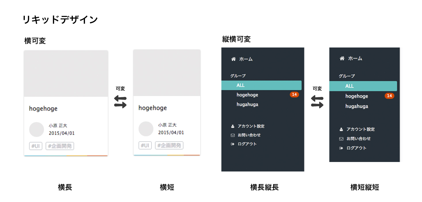 はじめに「機能の見た目」についてのコーディングですがリキッドデザイン的に開発を行いました。ここでのリキッドデザインとは外枠に依存した縦横サイズなどが可変な実装のことを意味しています。以下のような実装になります。