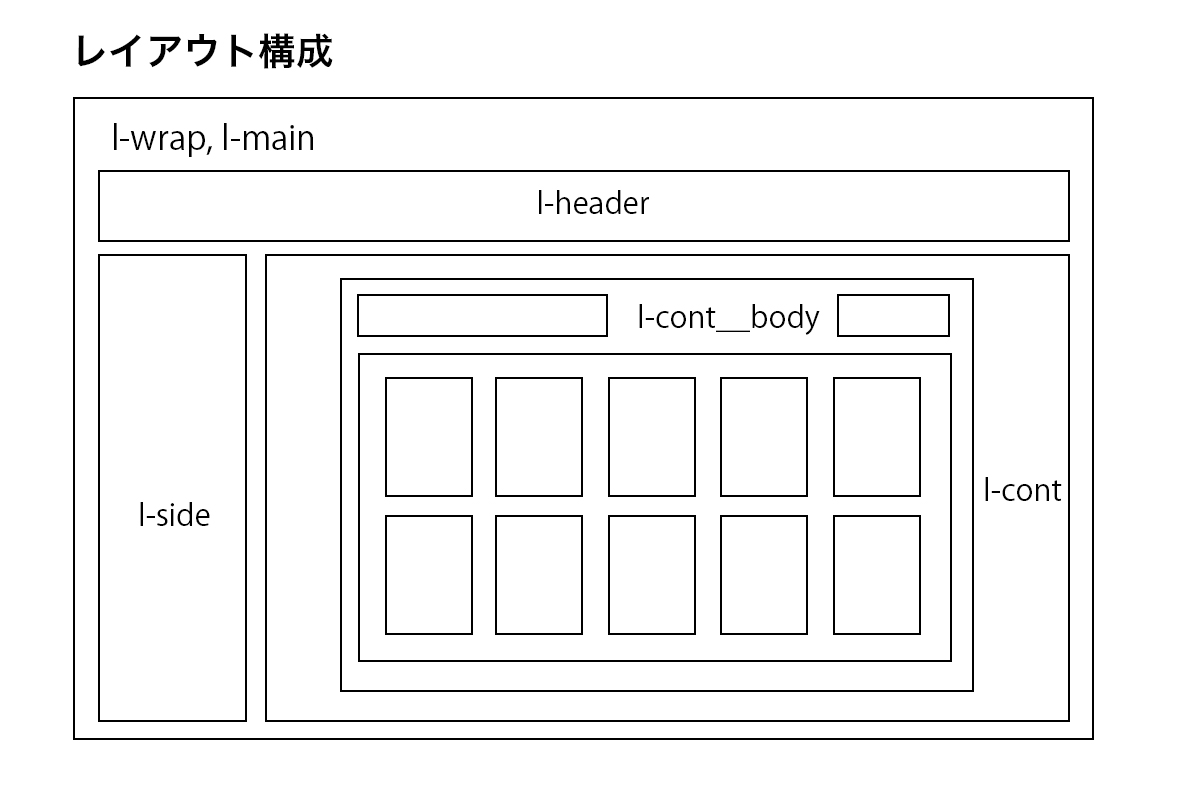 class="l-cont"のように"l-"のプレフィックスをつけていますが、これはレイアウトを構成するcssであること明示化するためにSMACSS的な記法を真似しています。BEM記法を利用した時と同じでここでの役割はただの命名規約で「機能の配置」を明示的に独立させるために利用したシンボルのようなものです。