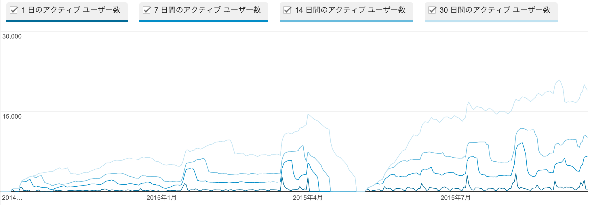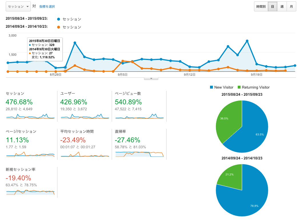 まずは累計のユーザーサマリーを見ていきます。2014年9月24日から2015年9月23日(当記事執筆時点)までの期間で数字を出しています。公開当初は一日たったの27セッション程度だったのが、一年間でこれくらいにまでなりました。2015年8月のピーク時で3,775セッション / 日となっています。