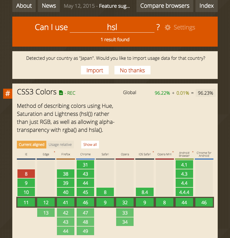 この他にも CSS3 からは HSL という形式の色指定が出来るようになりました。あまり普及していない印象を受けますが、これはこれで中々のポテンシャルを持った機能なので、ひとつ調べてみることにしました。