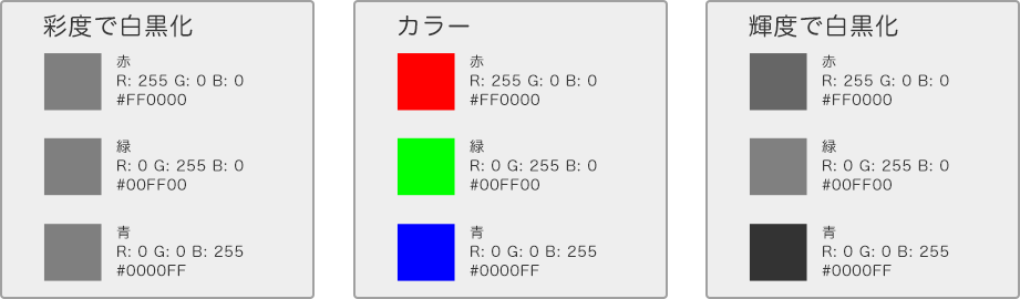 色の発光度合いを表します。カラーで撮影した写真や映像を白黒にする時はこの輝度を調整することで実現するのが一般的です。彩度を 0 にして白黒化することも出来ますが、彩度による調整は全体的にのっぺりした印象になってしまうので普通は輝度を調整します。