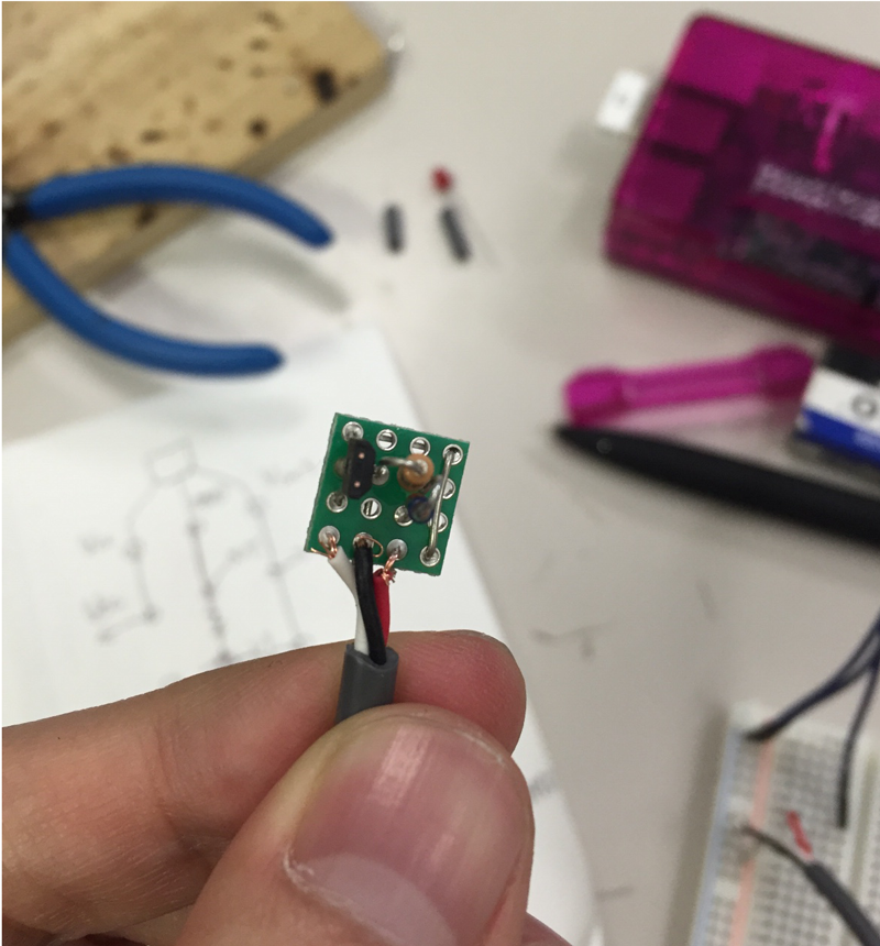 1枚目の写真が上記の回路図通りにセンサーの回路と延長用の三芯ロボットケーブルを16ホールユニバーサル基板に半田付けしたものです。