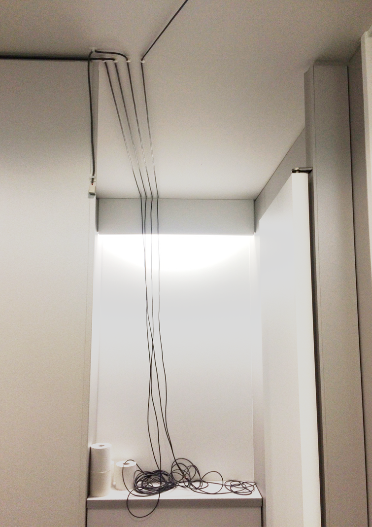 2枚目の写真はそれぞれの部屋から天井を伝って這わせたケーブルを1つの個室へ集めています。Raspberry Piへの電源供給はトイレ個室にある電源を利用しています。