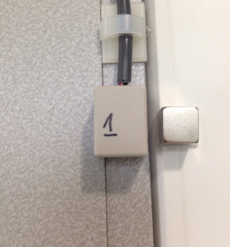 3枚目の写真は実際にセンサーを扉に貼り付けている写真です。扉が閉まっている時に磁石がセンサーに近づくようになっておりこの磁力を感知して扉の開閉判定を行っています。