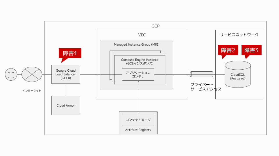 今回は3つの障害に対処しました。それぞれの障害は以下の箇所で発生しましたが、発生箇所のアナウンスはなく、自分たちで特定する必要がありました。