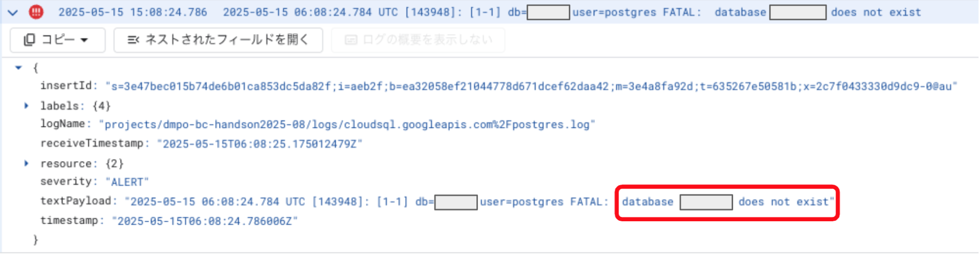 しばらくすると、再びサービスにアクセスできない状態に陥りました。ログを確認すると、データベースが存在しないというエラーを確認しました。