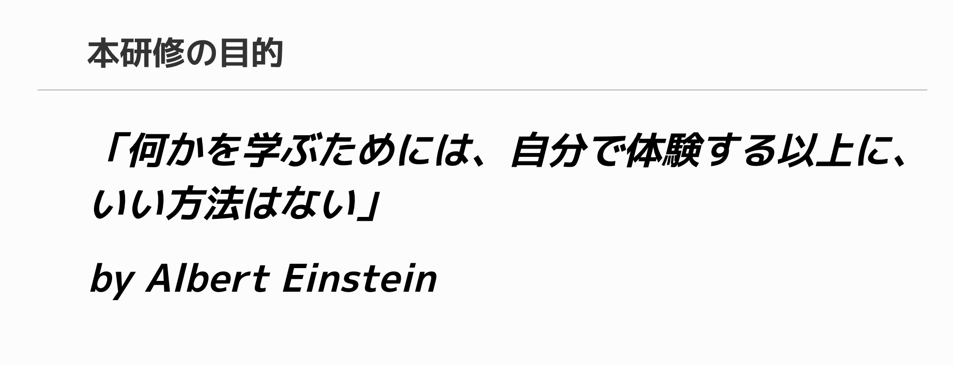 最後に、総括の際に本研修の目的として講師の方が挙げられていたアルベルト・アインシュタインの言葉 「何かを学ぶためには、自分で体験する以上にいい方法はない」 この精神を忘れずに今後も積極的にチャレンジしていきます!