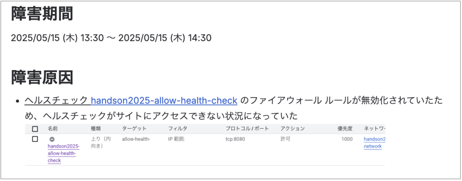 - 対応策として、ヘルスチェックに必要なFirewallルールを有効化し、無事サービスは復旧しました。