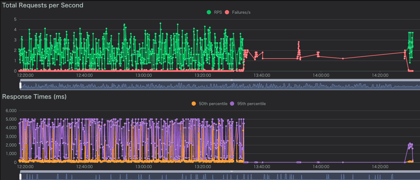 Locustを確認すると、エラー発生 (13:30) 後からFailures/sが急増していることが確認できました。