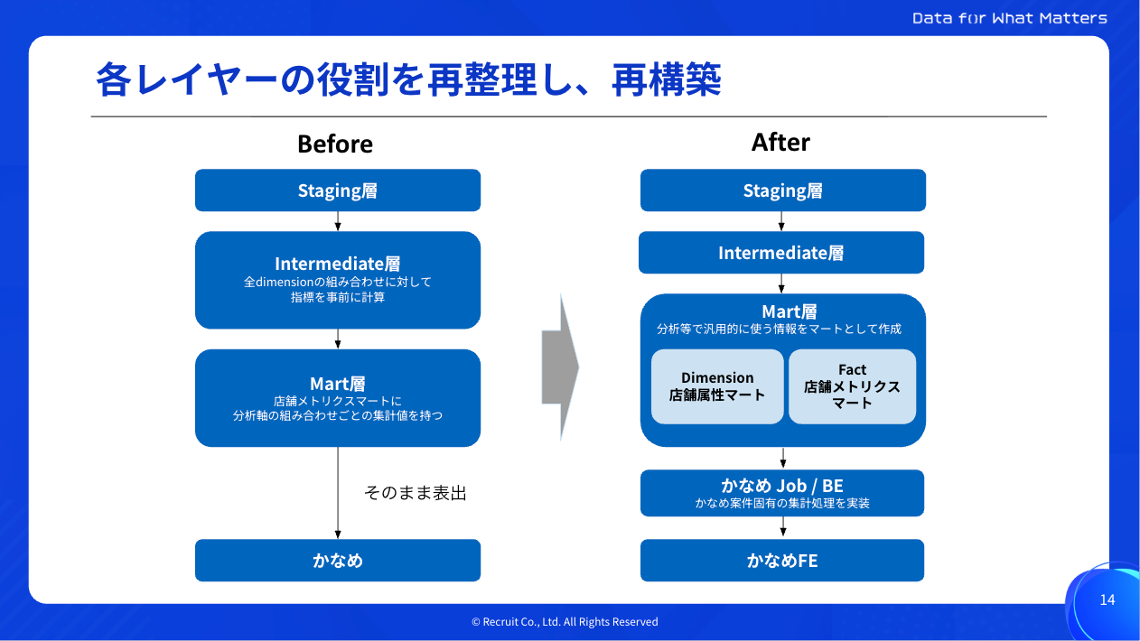 この再整理により、指標定義と集計ロジックが分離され、仕様変更時の影響範囲が極小化して開発効率が向上。AEが作成したマートは他案件でも利用可能な汎用的資産となり、組織間の責務も明確になりました。