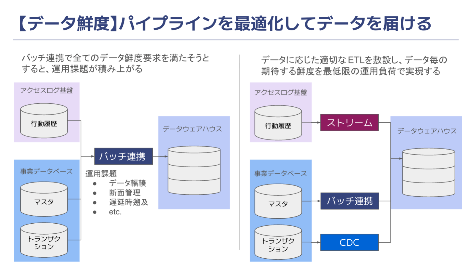 収集するデータに応じて適切なETLパイプラインを設定し、運用負荷を抑えつつ、各データに求められる鮮度を担保する仕組みを構築しています。