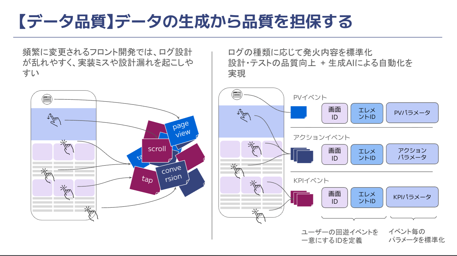 頻繁なフロントエンドの変更は、ログ設計の乱れや実装ミスを招きがちです。そこで、ログの種類に応じて発火内容を標準化し、分類して収集する体制を整えました。