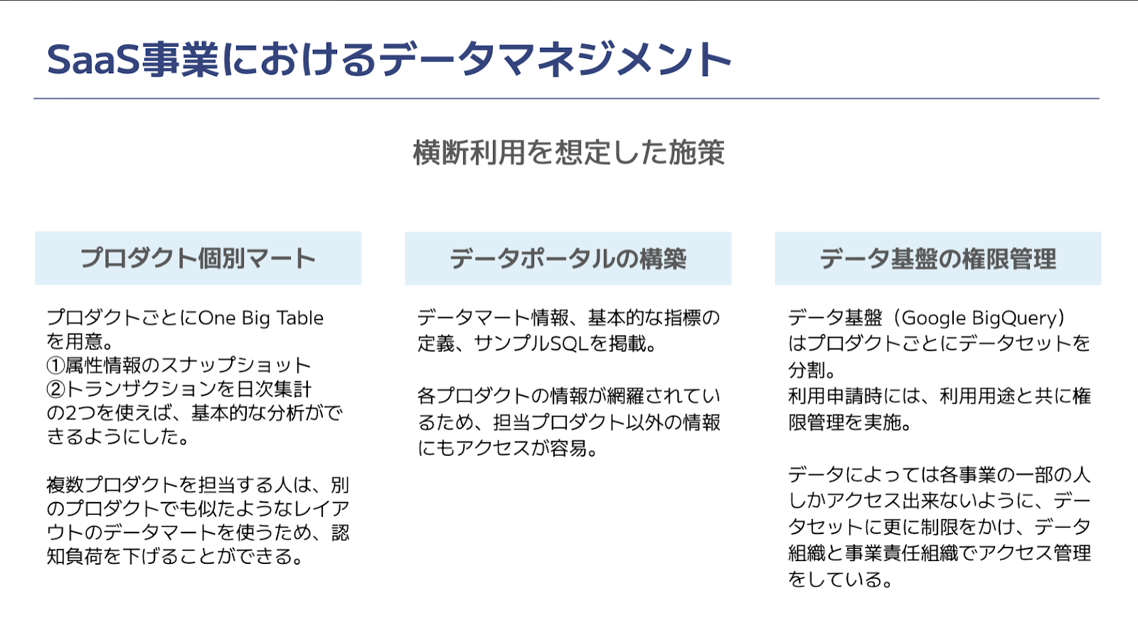 この状況を支えるため、データマネジメントチームでは3つの施策を実施しています。