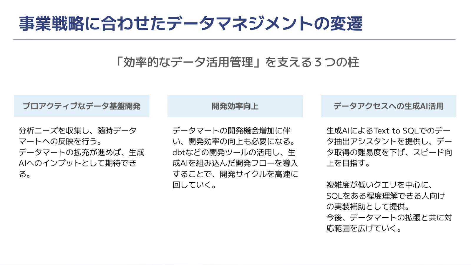 このような変化を受け、効率的なデータ活用管理を支える「3つの柱」を以下のように定義しました。