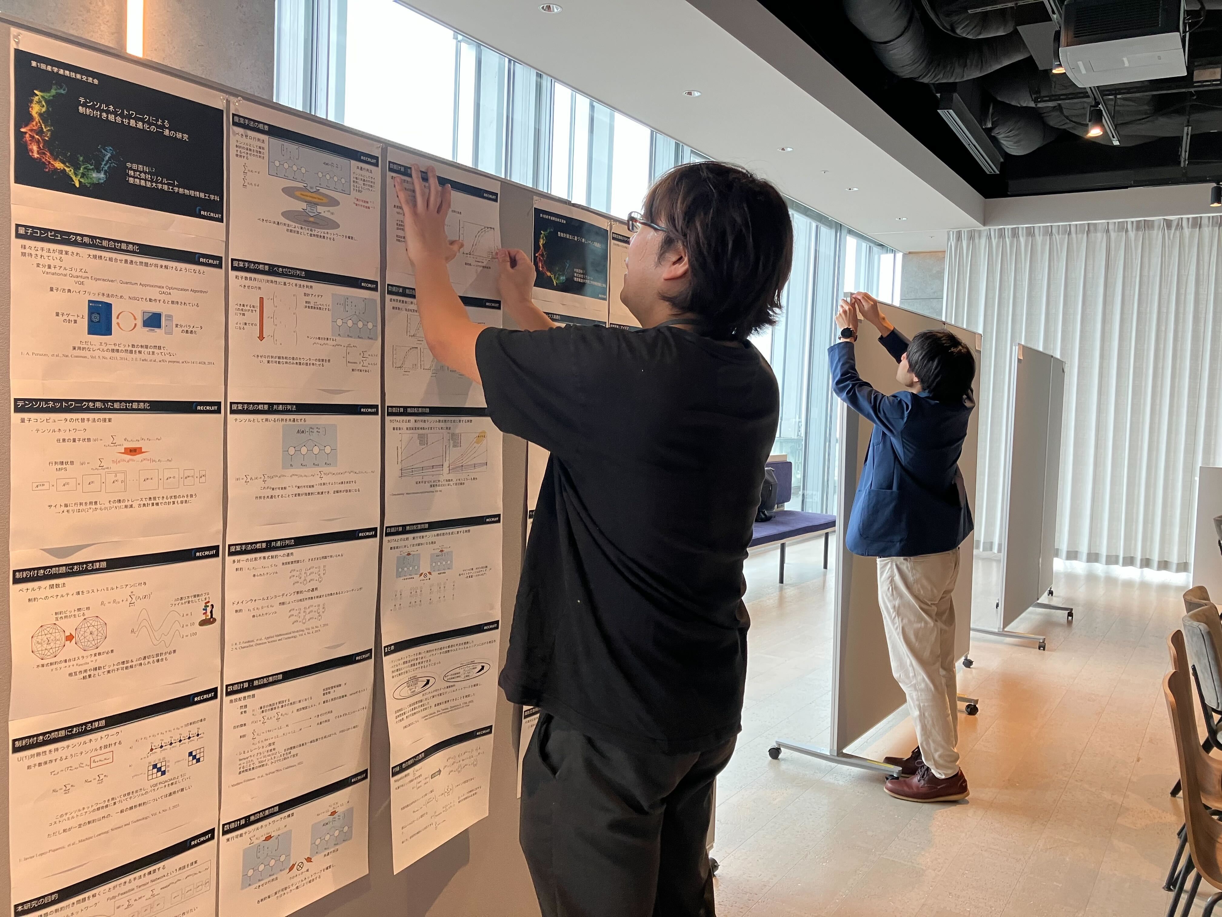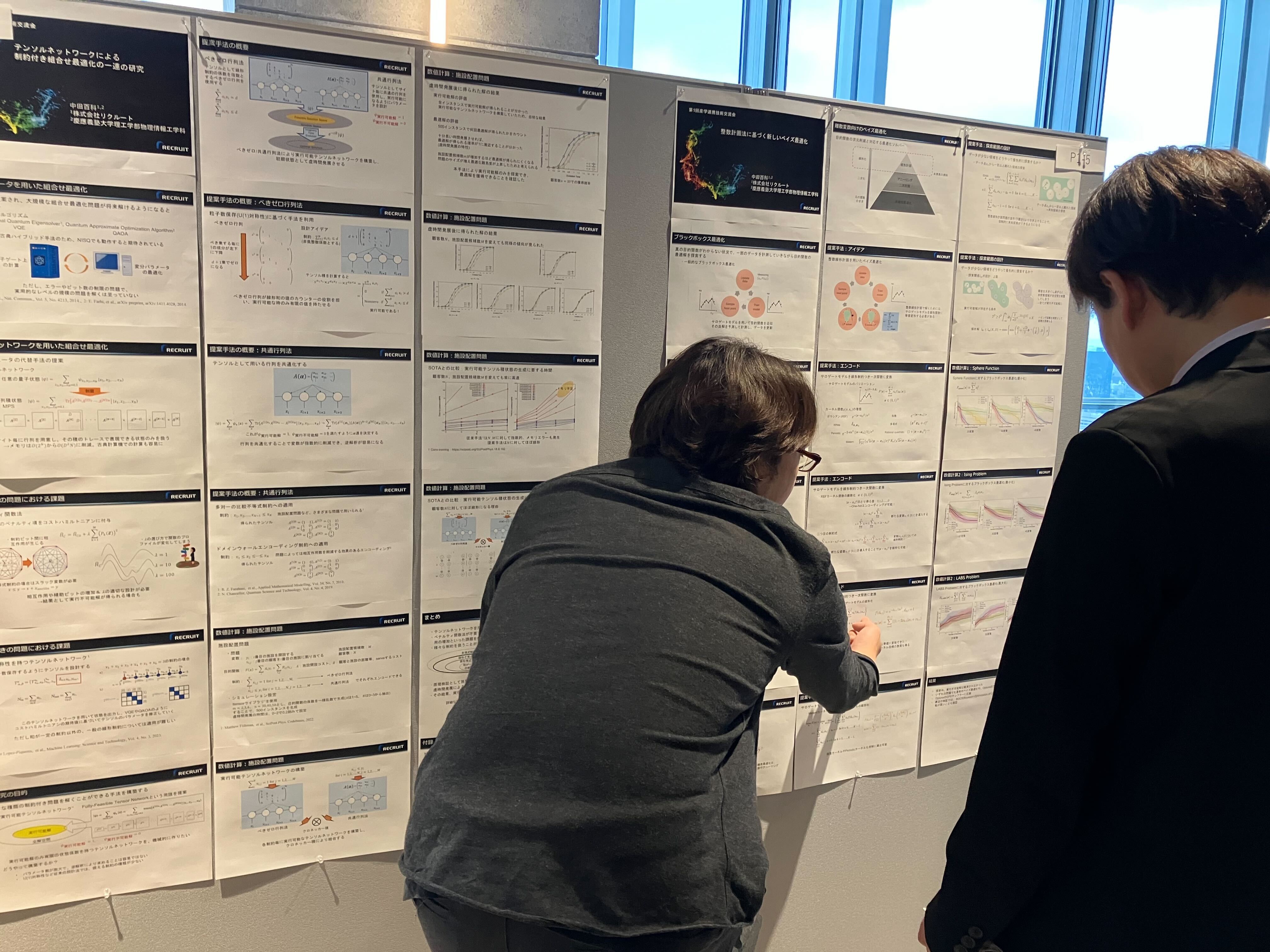 合計34件のポスターが掲示され、数理最適化や機械学習、自然言語処理、人工知能といったデータサイエンスの王道を行く研究から、量子コンピューティングやHPC(ハイパフォーマンス・コンピューティング)、サイバーフィジカルシステム、知的システムアプリケーションといった最先端の計算・基盤技術、そしてマルチエージェントシステム、計算社会科学、経営工学、マーケティングといった社会実装に直結する理論まで、極めて多角的な専門領域が凝縮され、領域の垣根を超えた刺激的な知の交差が実現しました。