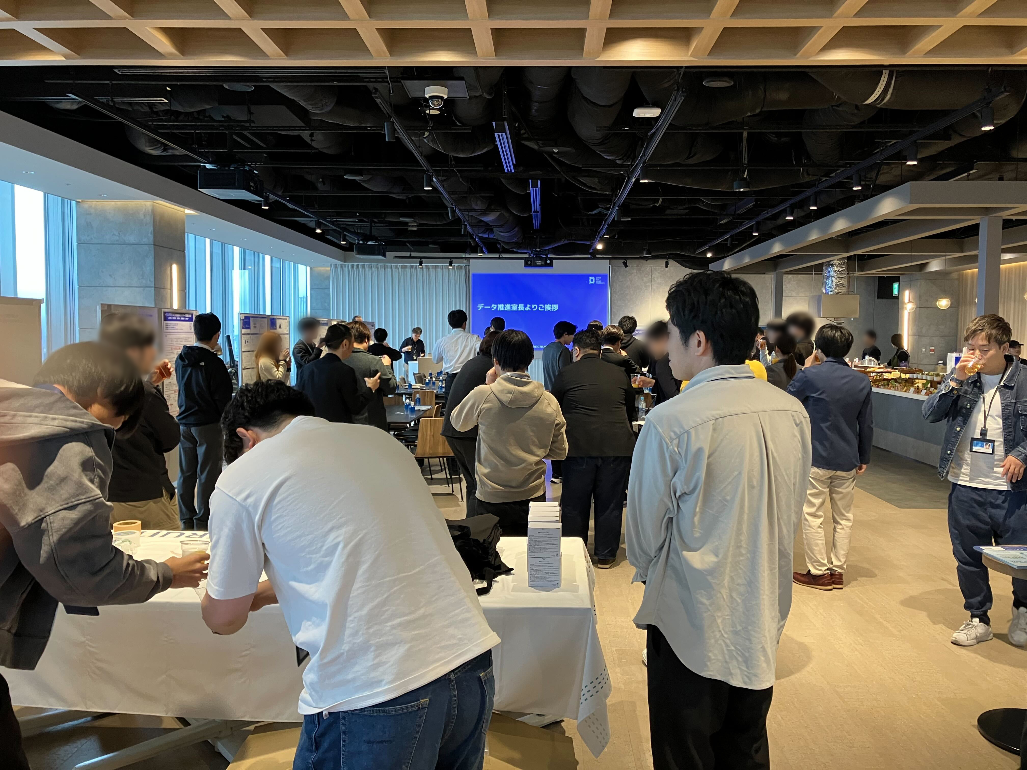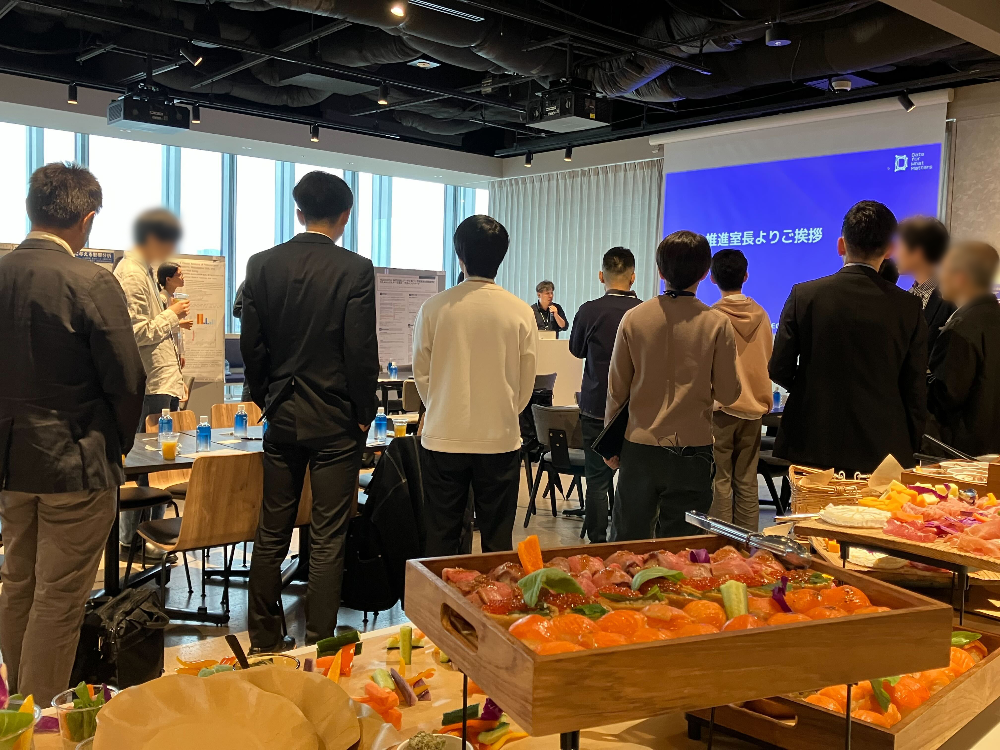 基調講演後は、データ推進室の室長の挨拶を皮切りに、ポスター発表・情報交換会へと移行しました。会場には食事やドリンクが用意され、参加者の皆様は飲食を片手にリラックスした雰囲気で交流を楽しんでいました。